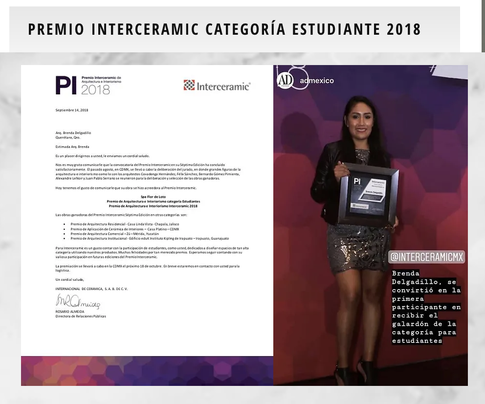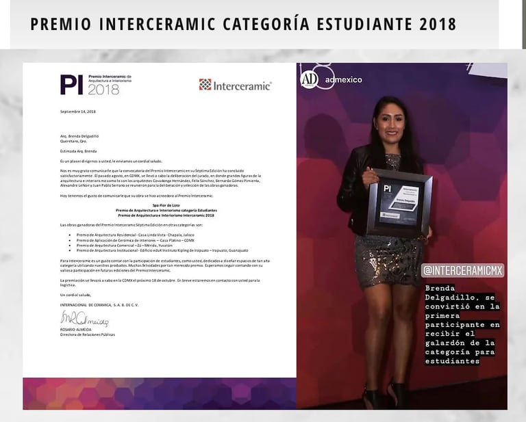 Premio Interceramic abrió la convocatoria para recibir aquellos proyectos arquitectónicos y de interiorismo que por su creatividad, pasión y trabajo merecen ser distinguidos. Donde Brenda Delgadillo, estudiante del INSTITUTO VIA DISEÑO se le otorgó el premio de Interceramic de Arquitectura e Interiorismo a nivel nacional y se convirtió en la primera participante en recibir el galardón de la categoría para estudiantes.
